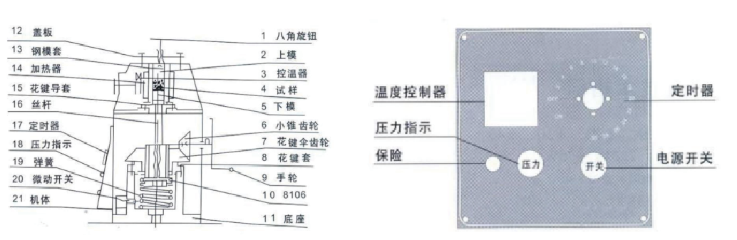 1.本機(jī)擁有旋轉(zhuǎn)機(jī)體外手輪,通過(guò)一對(duì)傘齒輪帶動(dòng)機(jī)體內(nèi)絲桿使壓制試樣的下模在剛模套內(nèi)上下移動(dòng),熱因性塑料連同鑲嵌的試樣的試樣在加熱的條件下成形。試樣制備過(guò)程中的成形壓力由固定在集體內(nèi)的彈簧自動(dòng)補(bǔ)償、試樣壓制的壓力可由信號(hào)燈給以指示。